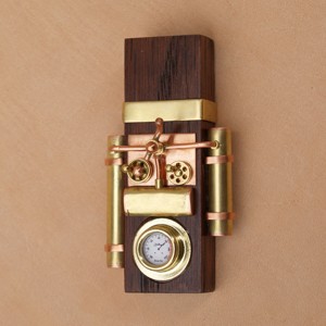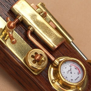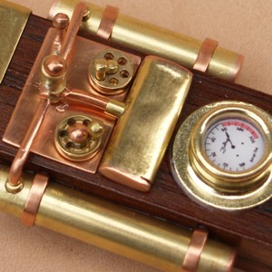Features include moving valves, control wheels, cocks and what-not. Bright copper piping connects the components into a pleasing whole.